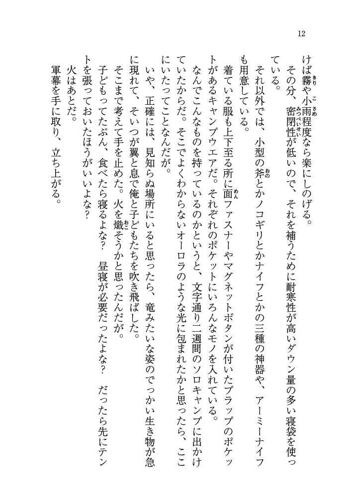 やんちゃな異世界王子たちとアウトドアでキャンプ飯! 著者︰ 朝陽ゆりね カバーイラスト:ちょめ仔 発売日:2022年12月19日 定価:本体650円+税 Amazonで購入 楽天ブックスで購入 配信ストアはこちら 故郷目指して王子兄弟と異世界アウトドア生活!! 大学生のコージは趣味のソロキャンプに出かけた先で突如光に包まれ異世界へ。だが、いきなり目の前にはドラゴンが! そのままひと息で吹き飛ばされどこかの山奥で遭難するハメに。傍らには驚く幼い王子兄弟がいて、どうやら一緒に吹き飛ばされてしまったらしい。アウトドアの知識を活かし兄弟の故郷、ファイザリー王国への帰還を目指す三人だったが、コージは慣れない子供の世話に悪戦苦闘する。ところが、弟王子ナリスが発熱してしまい──!? ▼ 試し読み ▼ 試し読みをするには、画面を右にスライドしてください。 最初に戻る 朝陽ゆりね作品その他 やんちゃな異世界王子たちとアウトドアでキャンプ飯! 2